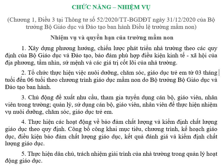 Sứ mệnh của chúng tôi là: Tạo dựng được môi trường giáo dục an toàn, thân thiện; chất lượng nuôi dưỡng, chăm sóc và giáo dục tốt, mỗi trẻ đều có cơ hội phát triển một cách toàn diện.