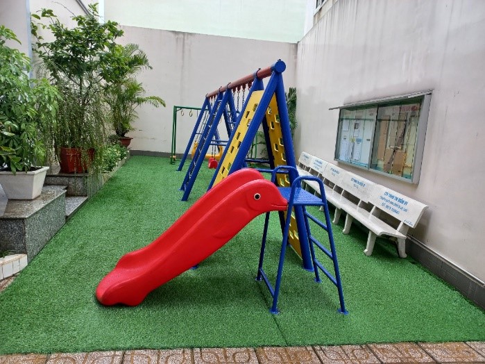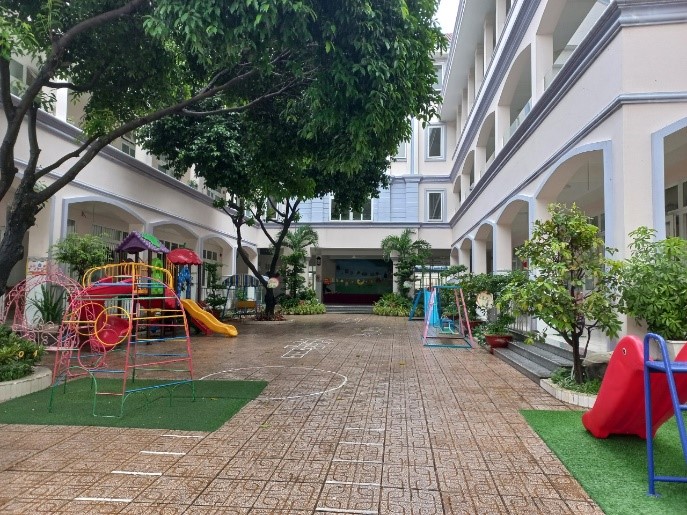 Trường có sân chơi rộng rãi, thoáng mát, nhiều cây xanh, môi trường xanh – sạch – đẹp với tường rào bao quanh an toàn cho trẻ vui chơi hoạt động. Trường có bếp ăn khang trang và hệ thống trang thiết bị cần thiết đáp ứng công tác nuôi dưỡng, chăm sóc và giáo dục trẻ.